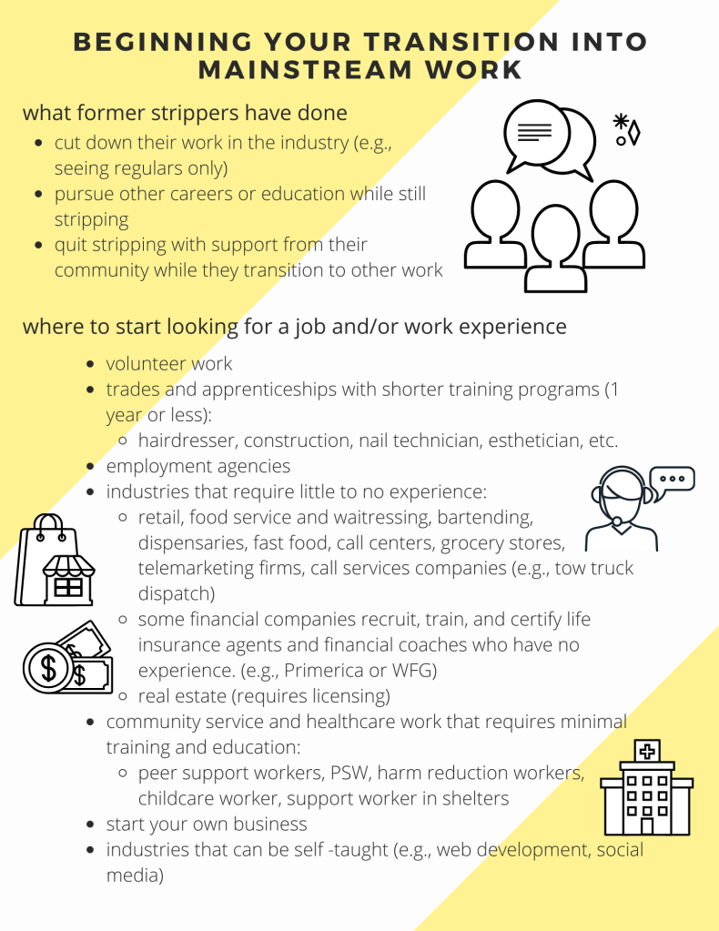 We believe that stripping is real and valuable work that does not require an ‘exit’ strategy. However, if you feel like it’s time for a new career, we’re here to help. The infographic below gives a brief overview of what transitioning to mainstream work can look like. Read on for more things to consider when making the transition from stripping to mainstream work.